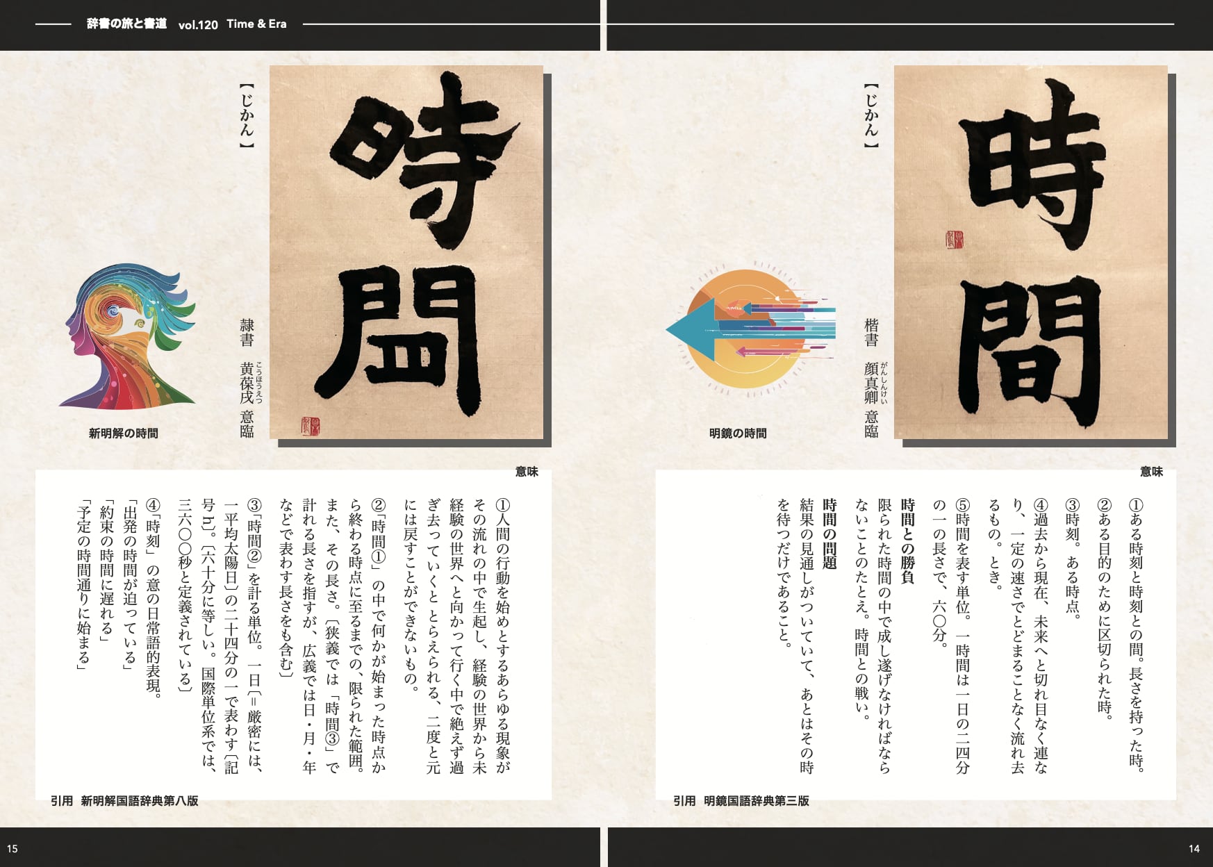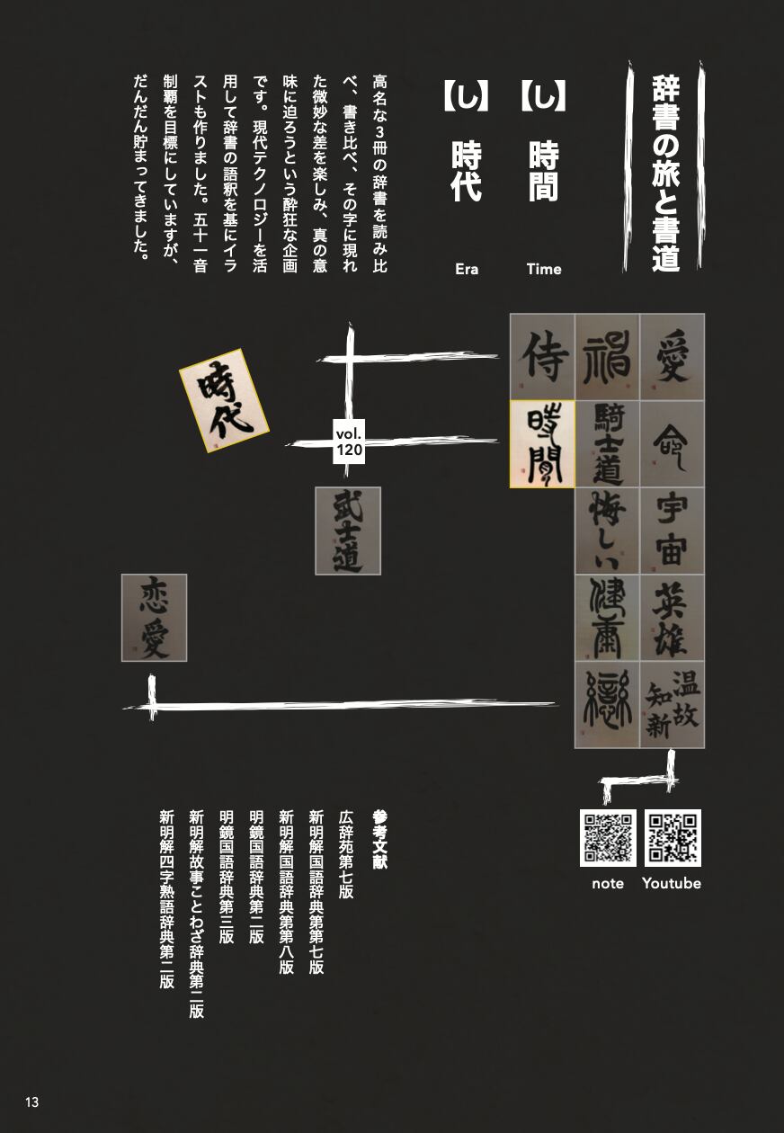現在は辞書の旅特集と銘打って新明解国語辞典、明鏡国語辞典、広辞苑という3冊の辞書の意味を読んだ直後に揮毫(きごう・筆で書くこと)し、真実の意味を探ろうという酔狂な企画を行っています。