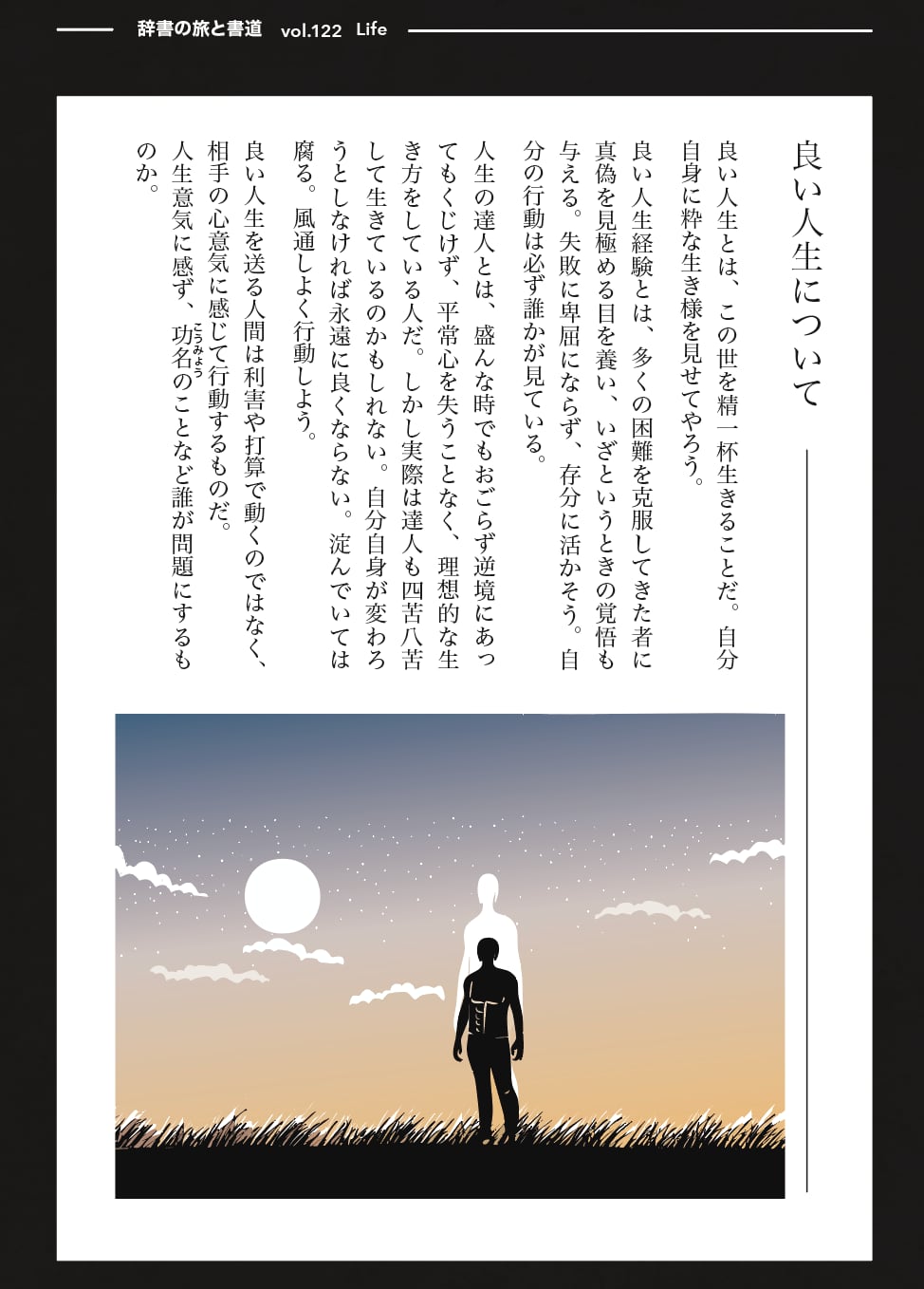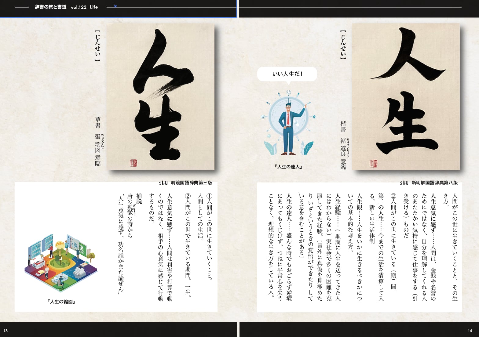 現在は辞書の旅特集と銘打って新明解国語辞典、明鏡国語辞典、広辞苑という3冊の辞書の意味を読んだ直後に揮毫(きごう・筆で書くこと)し、真実の意味を探ろうという酔狂な企画を行っています。