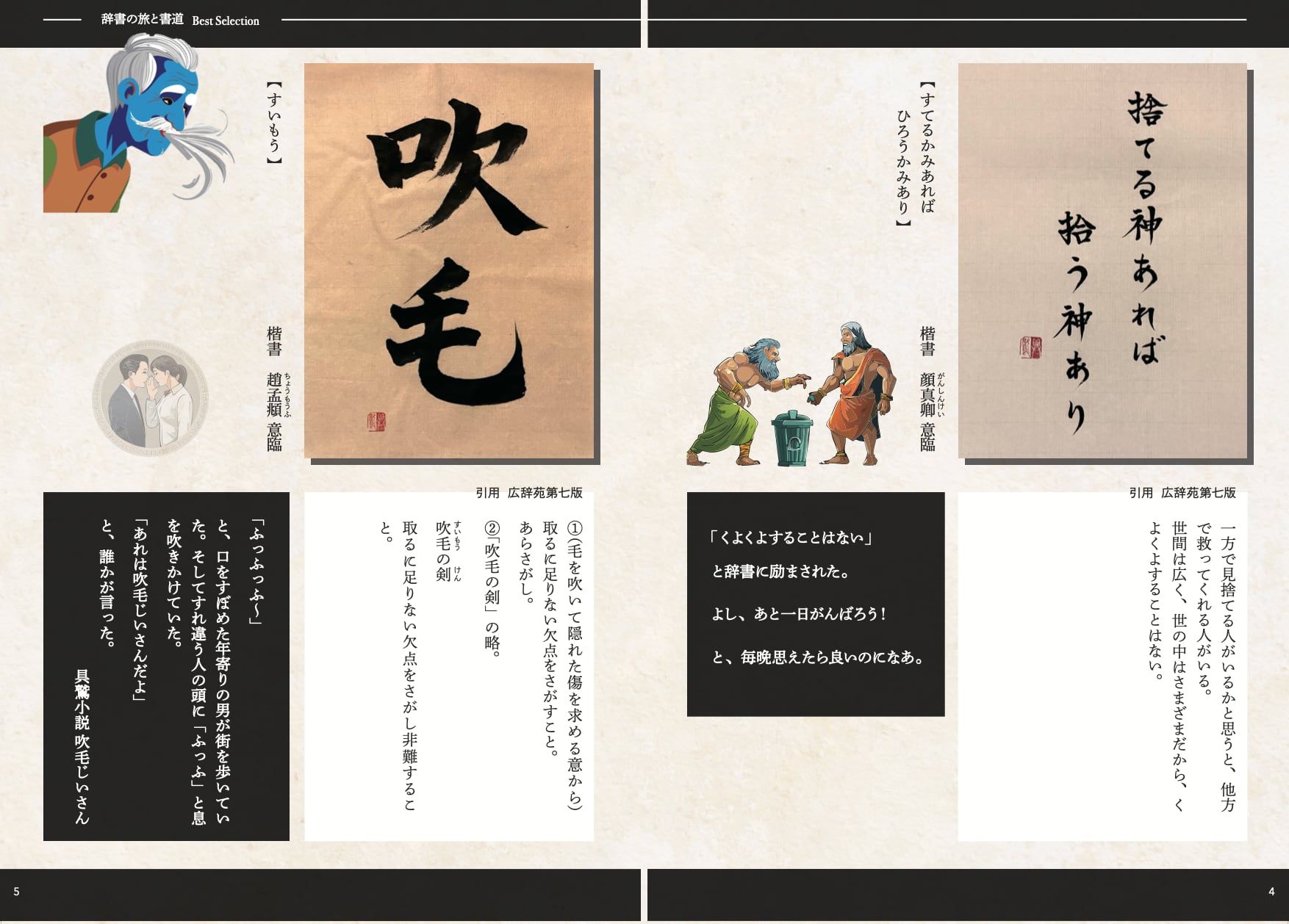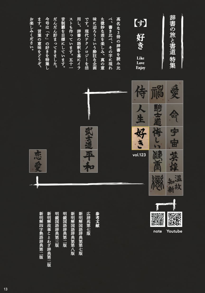 現在は辞書の旅特集と銘打って新明解国語辞典、明鏡国語辞典、広辞苑という3冊の辞書の意味を読んだ直後に揮毫(きごう・筆で書くこと)し、真実の意味を探ろうという酔狂な企画を行っています。
