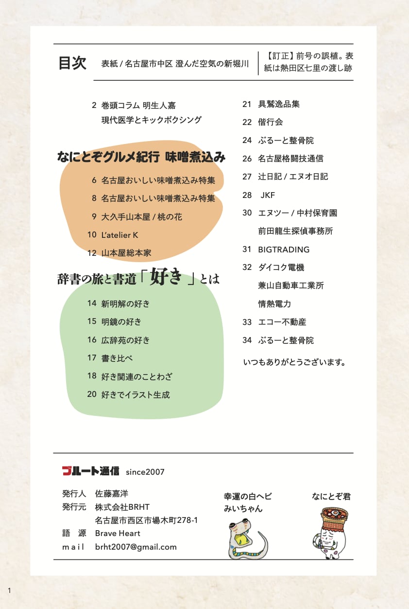 ブルート通信は、名古屋で2000部発行している月刊誌です。辞書の旅、書道、グルメ、格闘技、逸品をメインに取り上げています。